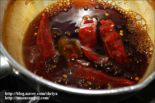 홍고추와 청고추는 씨를 빼서 잘게 다진 다음 다진 마늘, 간장, 물, 참기름, 설탕을 넣고 버무려서 만든다.
