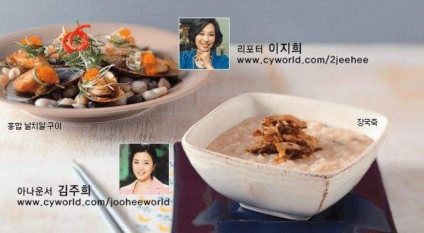 | 재료 그린 홍합 2팩(1.6kg), 양념(다진 양파 200g, 날치알 150g, 화이트 와인 약간, 마요네즈 60g, 소금·후춧가루 약간씩), 고명(모차렐라 치즈, 파슬리 다진 것) 만들기 1_그린 홍합은 전자레인지에서 5분간 해동한 다음 넓은 접시에 종이 타월을 깔고 홍합을 엎어 놓는다. 2_양파는 다져서 소금을 약간 뿌려 절인 다음 물기를 꼭 짠다. 3_날치알에 화이트 와인을 잠길 정도로 부어 해동 후 체에 밭쳐 놓는다. 4_분량의 양념을 섞어서 그린 홍합 위에 고루 얹어 준다. 5_프라이팬에 홍합을 넣고 중간 불에서 5~7분 가열한 뒤 약한 불에 10분 정도 올린 후 모차렐라 치즈를 얹어 5분 더 구워내고 고명을 얹어 접시에 담아낸다. comment 음식도 음식이려니와 손으로 빚은 듯한 물고기 모양의 도자기 접시 위 담음새가 너무 예뻐 감탄을 자아내게 하는 메뉴. 그녀의 요리 솜씨는 익히 들어서 알고는 있었지만 막상 블로그에 들어가보니 솜씨가 여간 대단한 것이 아니다. 노영희, 박민주 등 여러 요리 선생님 밑에서 한 수 배운 솜씨가 한눈에 드러난다. 상세한 레시피는 물론 맛깔나는 음식을 예쁘게 담은 모양새뿐 아니라 그녀가 직접 구운 투박한 접시와 도자기, 촛대, 화병, 물병 등을 구경하는 재미도 있다. recipe 파인애플 소스 스테이크 구이부터 칠리새우, 중국식 꽃게 볶음과 블루베이 파이까지 매우 다양하다. 미역 자반 잘 튀기는 법 등 실전 쿠킹 팁들도 새겨둘 만하다. 재료 쌀 100g, 쇠고기 30g, 표고버섯 1장, 참기름 1큰술, 생수 3컵, 소스(진간장 1큰술, 다진 대파 1큰술, 다진 마늘 1작은술, 깨소금 1작은술, 후춧가루 조금) 만들기 1_쌀은 씻어 불려 건져 밥알이 반으로 부러질 정도로 빻는다. 쇠고기는 곱게 다지고 표고는 3cm 길이로 채썰어 간장, 참기름, 후춧가루, 다진 대파, 마늘, 깨소금으로 양념한다. 2_냄비에 참기름을 두르고 쇠고기, 표고버섯 순으로 넣고 볶다가 쌀을 넣고 볶은 뒤 쌀 분량의 6배의 물을 붓고 강한 불에서 끓이다가 불을 낮추어 쌀이 퍼질 때까지 눌어붙지 않도록 가끔씩 나무주걱으로 저으면서 끓인다. 죽이 잘 퍼지면 간장으로 빛깔을 보며 간을 맞춘다. comment 흔히 먹는 죽은 아니지만 한번 배워두면 좋을 법한 장국죽. 생각보다 레시피도 간단해서 시도해볼 만하다. 아나운서의 기본 자질에 요리 솜씨도 들어가는 것이 아닌가 싶을 만큼 요리까지 잘하는 그녀들. 김주희 아나운서는 주말을 이용해 한식 궁중 요리를 배우는 중으로 하나하나 배운 요리를 기록하듯 남긴 한식 사진이 구경거리. recipe 기본 한식 시험 메뉴에 들어가는 북어 보푸라기부터 겨자채, 홍합초, 오이숙장아찌, 북어구이, 너비아니, 육회, 호박선, 오이선 등의 한식 메뉴들을 정갈하게 만든 솜씨가 돋보인다. 재료 파인애플 200g, 모듬 어묵 200g, 슬라이스 햄 2장, 식용유 2큰술, 소스(물엿 150cc, 파인애플 즙 4큰술, 식초 1큰술, 깨소금 1큰술, 설탕 1큰술) 만들기 1_어묵과 슬라이스 햄은 병뚜껑으로 모양을 찍어내고 파인애플은 4등분한다. 2_팬에 식용유를 두르고 열이 올라오면 1의 재료들을 넣고 볶는다. 3_어묵이 조금 노릇해지면 분량의 소스를 넣고 잘 섞어 주면서 끈적하게 될 때까지 잘 볶아낸다. comment 아이들이 딱 좋아하는 달콤새콤한 맛의 어묵 볶음. 어묵은 간장으로 볶는다는 고정관념을 깬 색다른 소스가 재밌다. 그녀의 블로그를 구경하기만 해도 요리 자체를 즐거워 하는 그녀의 열정이 느껴진다. 잡지 촬영을 했던 메뉴들도 많고, 그녀가 직접 쓴 레시피를 직접 따라 해도 좋을 만큼 친절한 요리 폴더를 꾸미고 있다. 요리 구경하러 왔다가 다른 연예인들과 찍은 사진을 구경하는 재미도 있다. recipe 생라면에 샤브샤브 고기로 국물을 내 직접 집에서 만드는 일본 미소 라면, 깨소스가 들어간 색다른 골뱅이 깨무침, 특이하게도 요구르트가 들어가는 닭매운볶음, 메밀 쯔유가 들어가는 냉가지 조림 등 독특한 소스의 요리들이 많다. 재료 닭다리살 7개, 청피망·양파·황파프리카·브로컬리 각각 1개씩, 물 녹말 적당량, 밑간(닭소스 4큰술, 청주 2큰술, 소금·후춧가루 약간씩), 튀김옷(달걀 흰자 2개, 녹말가루 2큰술), 소스1(올리브 오일 3큰술, 마른 붉은 고추 5개, 마늘 8쪽, 생강 1톨), 소스2(간장 1큰술, 굴소스 1큰술, 청주 1큰술, 매실소스 1큰술, 두반장 1큰술, 식초 1큰술, 설탕 2큰술, 물 2큰술, 고추기름 3큰술, 참기름·소금·후춧가루 약간씩) 만들기 1_닭다리는 뼈를 발라 한입 크기로 썰어 밑간 양념을 한다. 2_야채는 한입 크기로 썰어 놓는다. 3_20~30분 재워둔 닭고기에 달걀 흰자를 묻힌 후 녹말 가루를 넣고 기름에 튀긴다. 4_팬에 소스1을 넣고 볶다가 매운 향이 나면 생강은 건져내고 소스2를 넣고 끓인다. 야채를 넣고 볶은 후 튀긴 닭을 넣고 물녹말로 농도를 맞춘다. comment 매짭닭이란 매콤짭짜름한 닭요리를 말하는 것. 요리에 어울리는 맛있는 이름이 뭐가 있을까 고심하다 그녀가 임시로 붙인 이름이 바로 ‘매짭닭’이다. 마치 인터넷 요리책을 넘겨보듯, 지인들을 옆에 앉혀두고 자신의 레시피를 얘기하듯 한 장 한 장 직접 만들어 올린 요리 사진들에는 아주 친절한 레시피가 곁들여 있다. recipe 근사한 와인 안주부터 먹다 남은 김치찌개